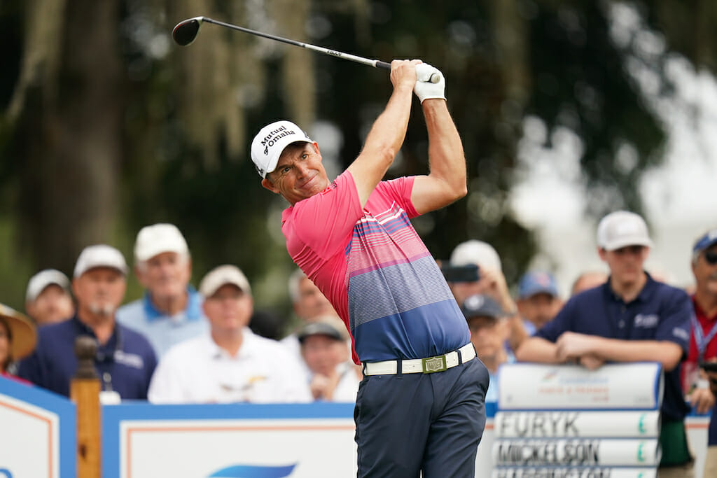 Padraig Harrington's PGA Tour Champions debut didn't quite go to plan but Darren Clarke is right in the thick of the action near the top of the leaderboard after a weather-affected round one of the Constellation Furyk & Friends
