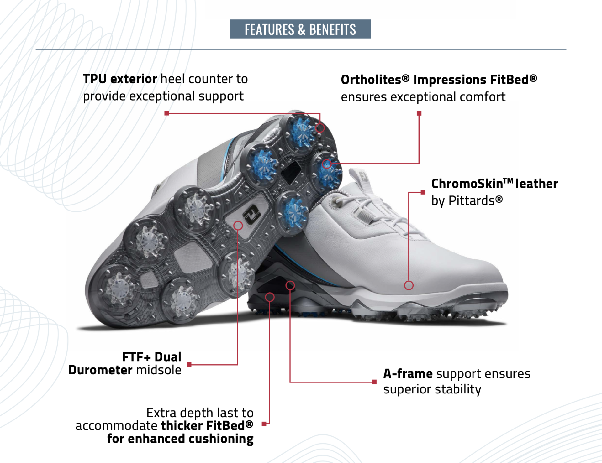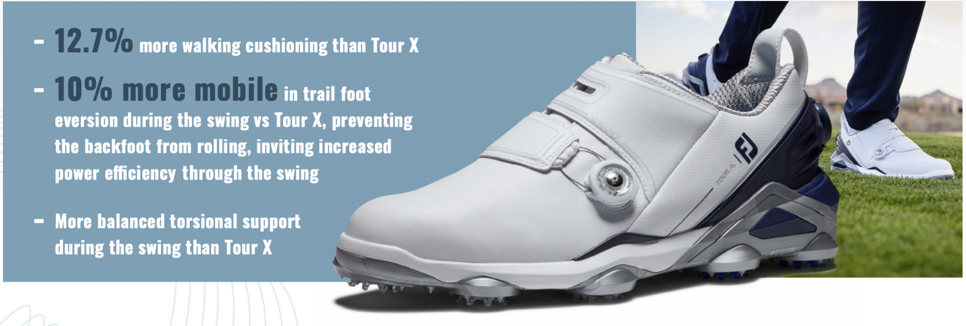 A firm perimeter heel piece, combined with a soft-core midfoot piece. The soft midsole supports the foot with comfort while the firm heel centres the back foot for controlled balance during loading in the swing. The darker areas of the shoe lock the golfer into the swing for ultimate stability while the lighter areas provide more comfort than FJ has ever had on a Tour series shoe before.