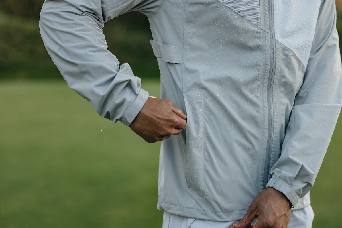Designed with lightweight fabrics for unrestricted freedom of movement, the predominantly light grey jacket with white paneling features a contrasting golf ball dimple print and a yellow and green brand logo to the chest for a supremely eye-catching look. A repositioned side seam and elasticated drawstring at the hem deliver a perfect fit, while front pockets keep hands warm and dry.
