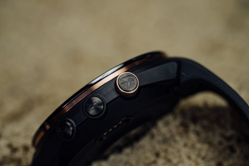 TaylorMade and Garmin have combined their passion for golf to create a unique and exclusive TaylorMade-branded Garmin Approach S70. The watch features the TaylorMade “Metal-T” logo on the button crown enclosed by a TaylorMade exclusive copper ring around the bezel with TaylorMade and Garmin markings on the keepers. The watch bands are brought together with a copper clasp.