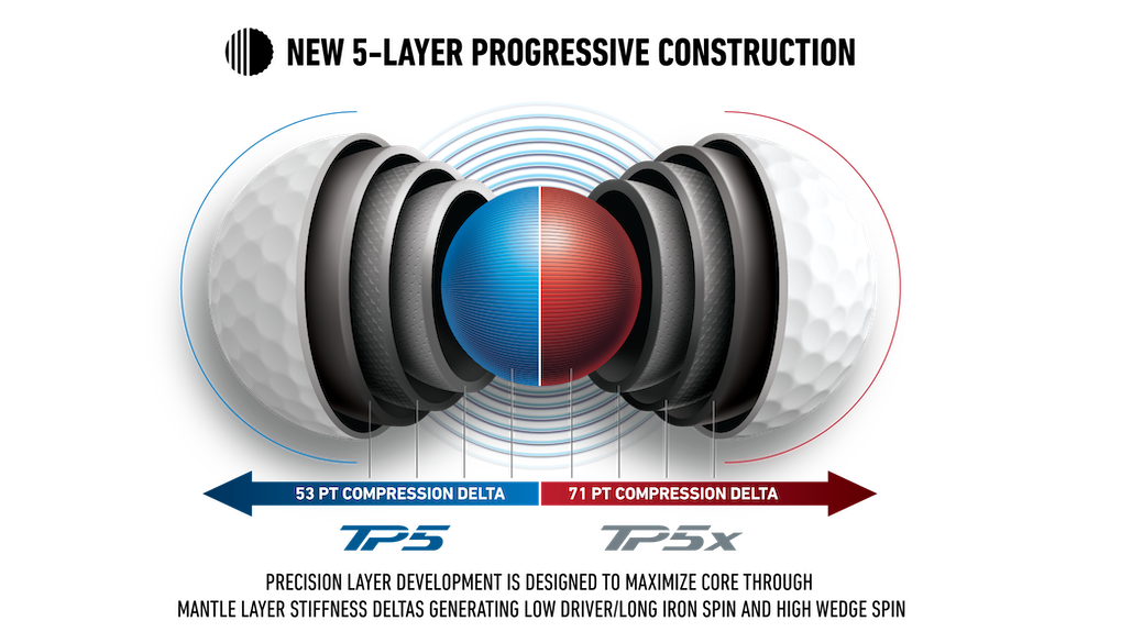 This results in reduced spin on drivers and long irons while enhancing spin control for wedges. It is this variability in driver and wedge spin that maximises the capabilities of five-layer technology and allows the new TP5/TP5x to maintain its leadership position as the most complete tour ball.