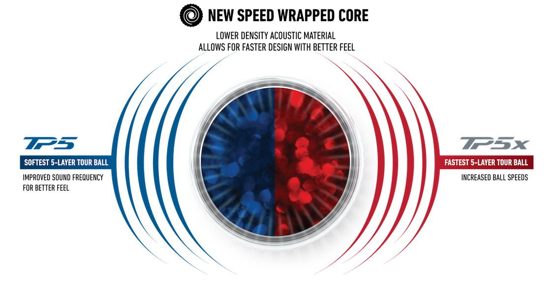 Continuing a trend of innovation and engineering, the 2024 TP5/TP5x relies on a combination of new technologies to provide the biggest jumps in performance to date. The most impactful change is the first-of-its-kind Speed Wrapped Core, which produces a softer sound with better feel while paving the way for a faster overall construction. In the 2024 TP5/TP5x, the use of core materials as the central element of decoupling feel and distance represents a game-breaking innovation in golf ball design.
