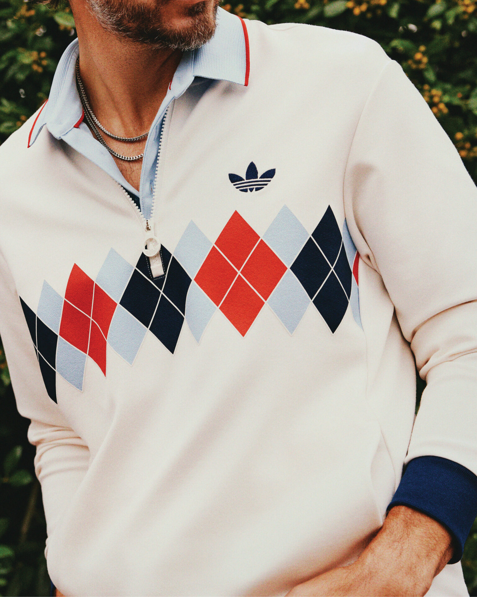 Layering pieces including the Originals Argyle Quarter-Zip made with modal materials and a Trefoil zipper pull and an Originals Full-Zip Jacket that includes a packable hood and elastic cuffs. A blended cotton-cashmere knit sweater and 3-Stripes Quarter-Zip round on the styling for the men’s range.