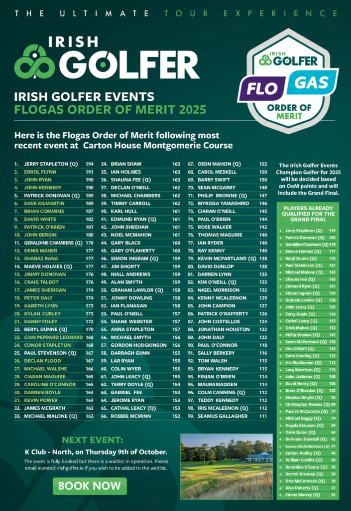 The Flogas Order of Merit for the Irish Golfer Events Series 2025 is now updated following the most recent event at Carton House – Montgomerie Course.