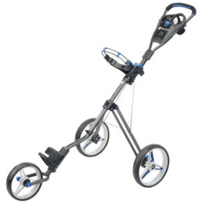 There’s ample storage space incorporated in the handle, including an accessory compartment; drink and scorecard holders; tee and ball holders; plus, an umbrella holder fitting. The oversized wheels are friction free and require no maintenance, plus they include the quick-release mechanism to save storage space if needed.