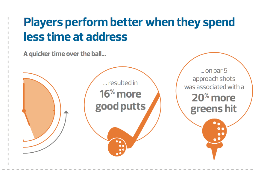 2. Quicker shots improve performance. A shorter time over the ball across all putts results in a 90 per cent increase in the likelihood of strokes gained.