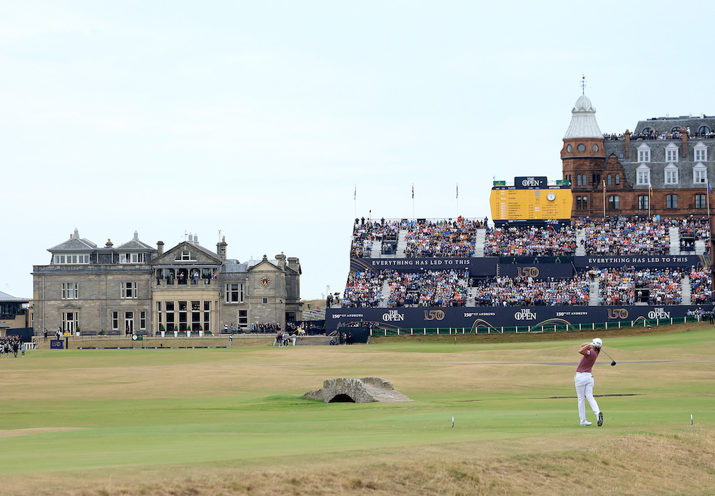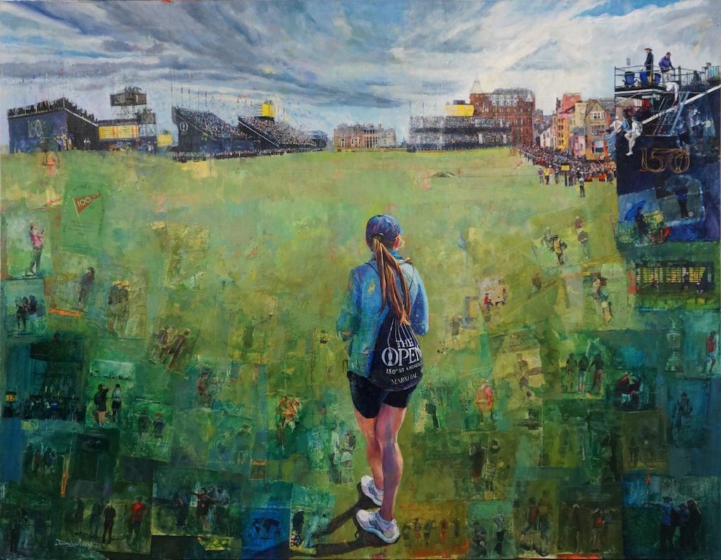 The painting is from the perspective of a young woman who is marshalling the 18th hole and depicts an array of visual references that evoke The Open – the players, spectators, grandstands and scoreboards as well as the iconic view of the 1st and 18th fairways with the Swilcan Bridge and The Royal and Ancient Clubhouse in the background.