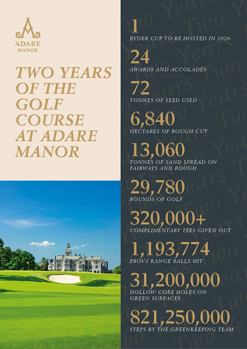 The Golf Course at Adare Manor is celebrating its second birthday, as the 5* resort reflects on a year of more awards and accolades and the headline news of being announced as the 2026 Ryder Cup venue.