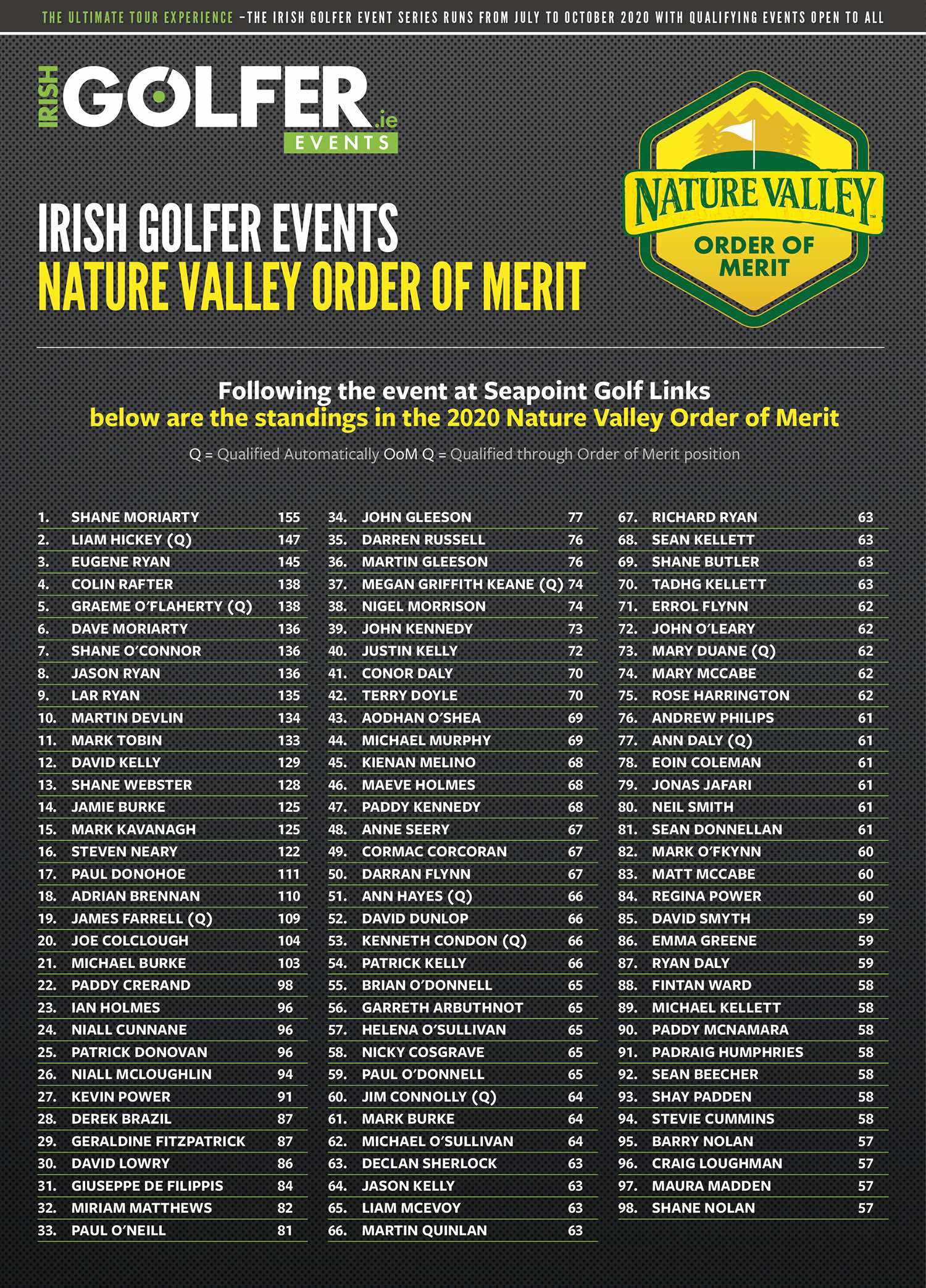 As ever, your four best scores across the season count towards the Order of Merit and the top 10 players not already qualified for the Grand Final will join us at the K Club to compete for the Champion Golfer 2020 title on the Palmer Ryder Cup course.