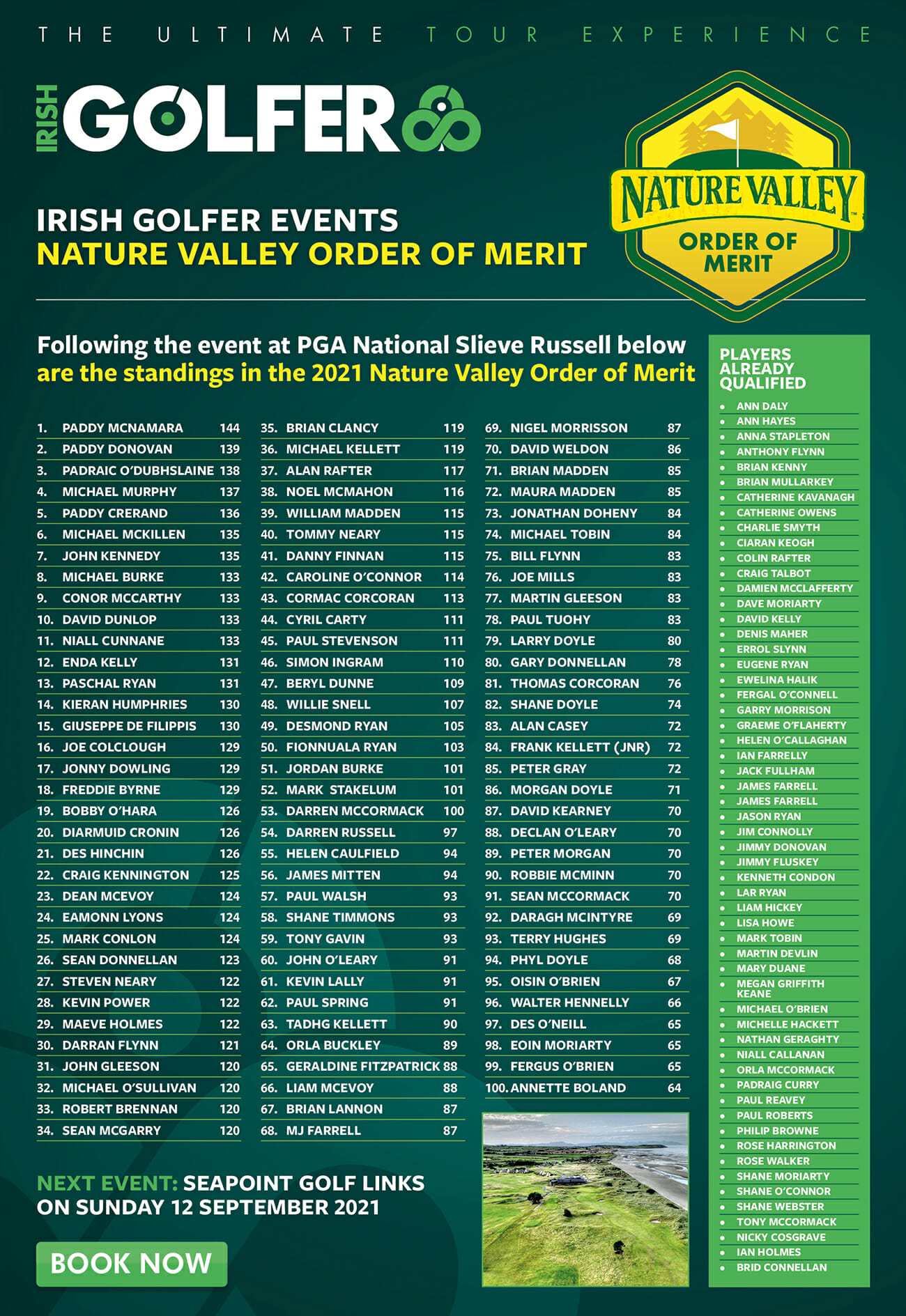 As ever, your four best scores across the season count towards the Order of Merit and the top 10 players not already qualified for the Grand Final (highlighted on the above graphic) will join us at The K Club to compete for the Champion Golfer 2020/21 title on The K Club Palmer North Course.