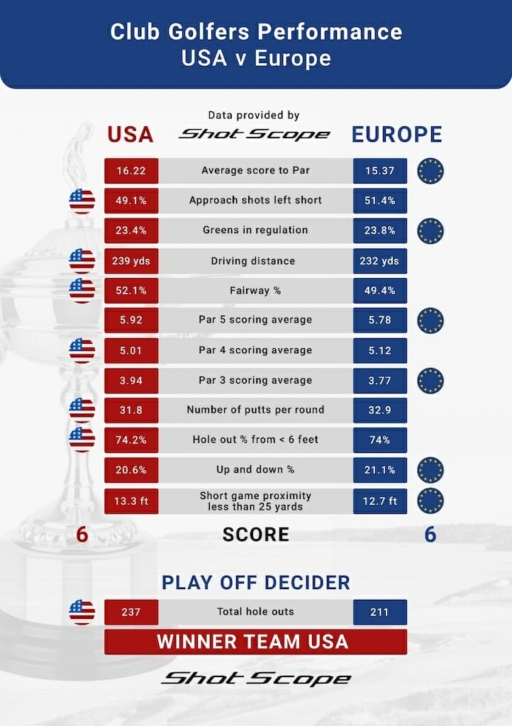 While the results show that Team Europe were clearly on top when it came to average score, Team USA dominated both off the tee and on the greens to clinch the overall victory. Some of the results in this list come with context, for example, Team USA took the point in the ‘Driving distance’ category by a comfortable six yards on average, which could perhaps be down to higher average temperatures. Team USA also picked up the points on the greens, which may be testament to the more consistent putting surfaces they enjoy year-round.