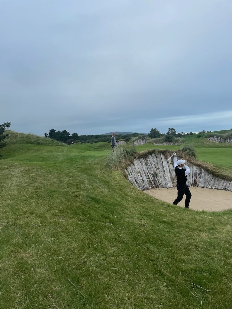 We figured we’d catch O’Keeffe around the fifth, cutting through the tropical brush by the clubhouse that felt more Copacabana than Brittas Bay. It took longer than expected to get there because we ended up joining three separate search parties for AWOL golf balls. It’s no wonder they went missing – in his efforts to help, Dad lost a shoe in the hay off the third. We found it before his three minutes were up. Safe to say no golf balls were located.
