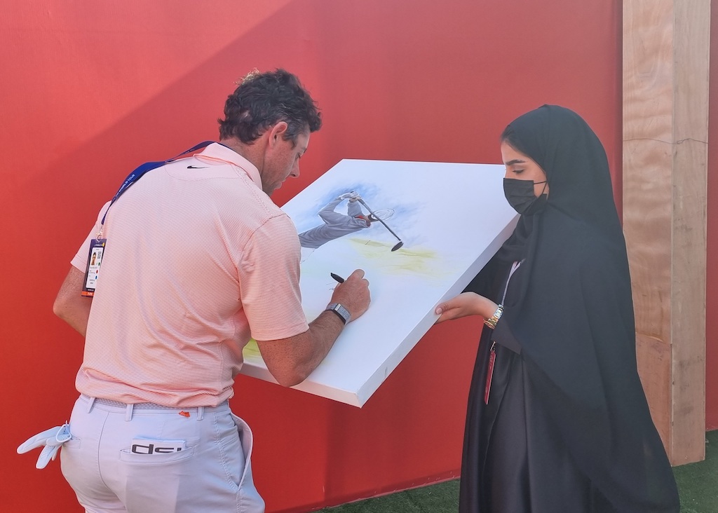 On this occasion, McIlroy had no qualms speaking with SKY Sports, spending a decent five minutes with a waiting handful of journalists before being asked by a Tour official to autograph around half-a-dozen caps and a few shirts. He also autographed a few items for four waiting children, had the odd selfie taken, gave away his Nike cap, and then personally autographed a painting of himself.
