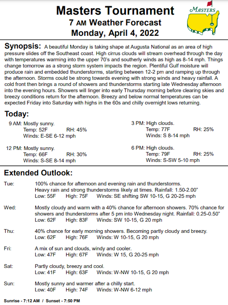 Here’s the overall forecast for the week of the 86th hosting of the Masters:
