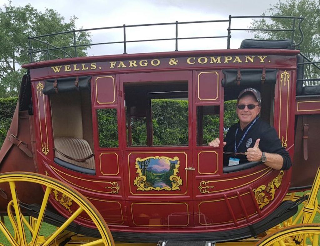 Continuing the theme as there’s a real Wells Fargo stagecoach to greet everyone attending the Wells Fargo Championship, and if you look closely at the TV coverage, the tee markers are miniature Wells Fargo stagecoaches.