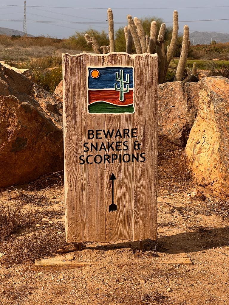 There are also a few signs about the course warning of snakes and scorpions.