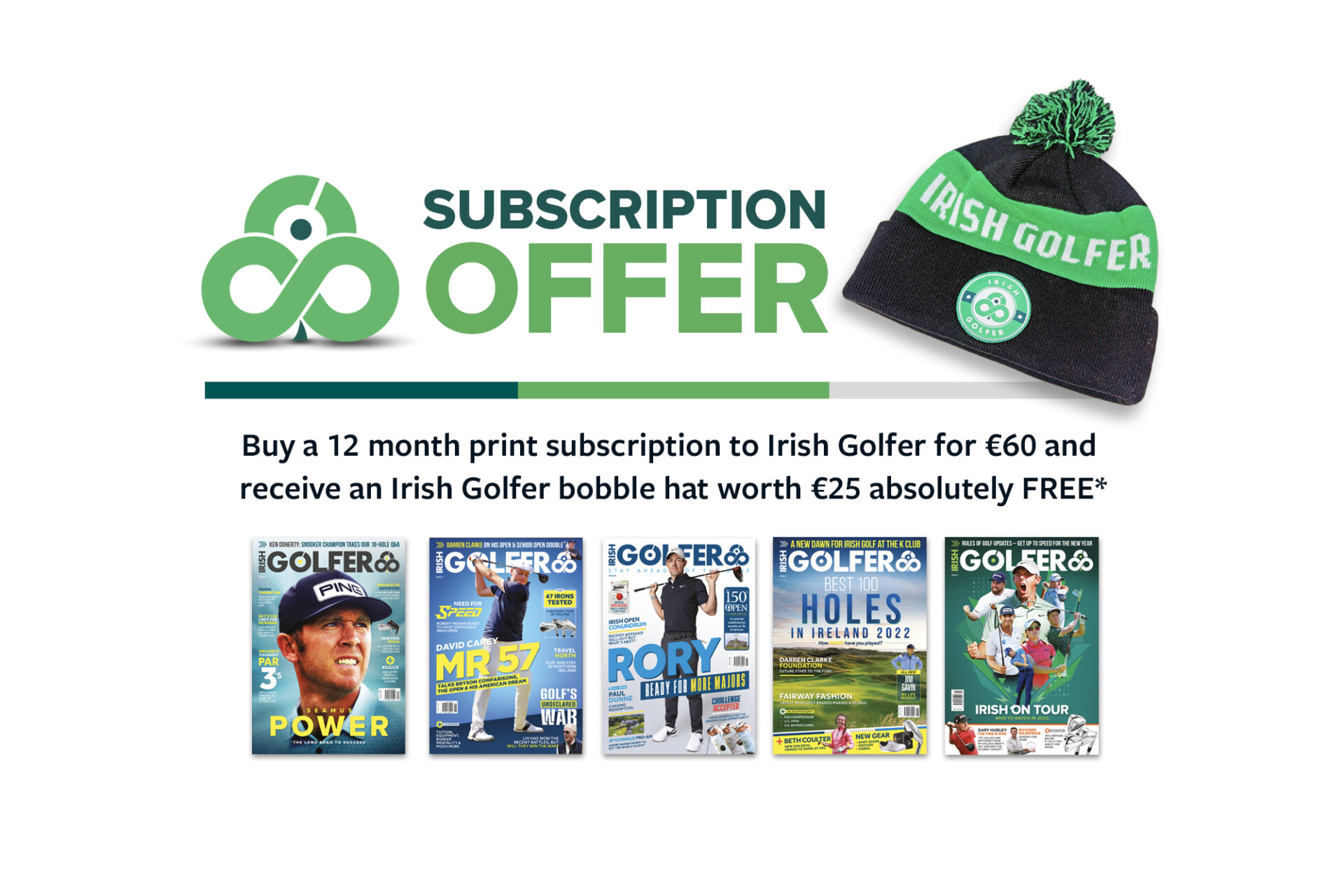 And in even better news, we’re offering an *Irish Golfer bobble hat worth €25 – Absolutely Free! – to anyone who purchases a 12-month print subscription of the magazine for the coming year. The annual subscription costs €60 and orders must be placed by December 21st to ensure a Christmas delivery.
