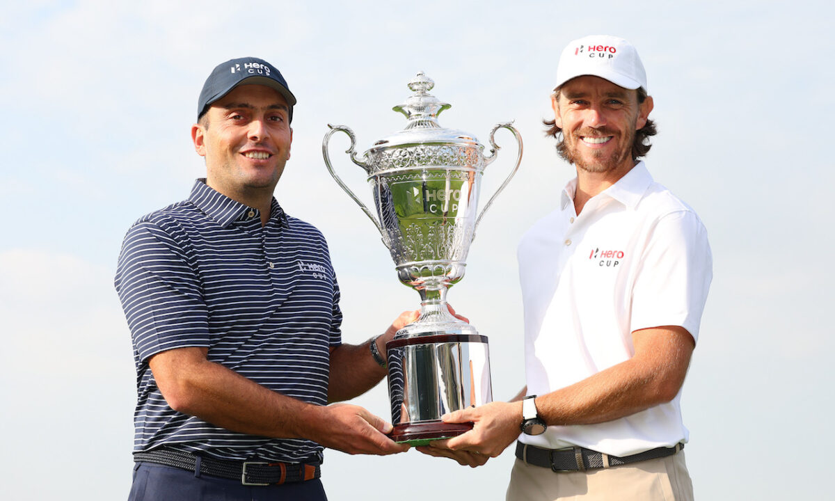 It was while enjoying a BBQ steak and downing an ice cold beer on the new terrace, and under the eyes of the stunning falcon clubhouse that overlooks the Abu Dhabi course, that the dozen Hero Cup players learned who they were being paired with and also their rivals for the opening Foursomes match of the 2023 Hero Cup.