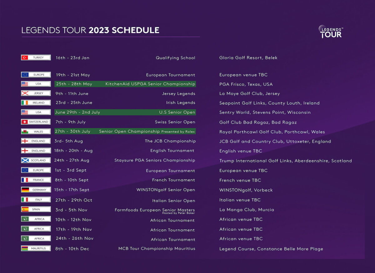 Major glory may be on the cards for the biggest stars of the Legends Tour, with the Senior Open Championship Presented by Rolex visiting Royal Porthcawl Golf Club in 2023, while the KitchenAid US PGA Senior Championship will be played at PGA Frisco, Texas and the US Senior Open will take place at Wisconsin’s SentryWorld Golf Course.