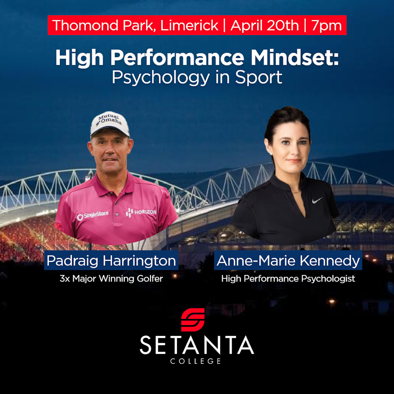 “High Performance Mindset: Psychology in Sport” will be a unique event hosted by Setanta College in which Harrington and Kennedy will lead an on-stage discussion by providing key insights into their respective successful careers in sport.