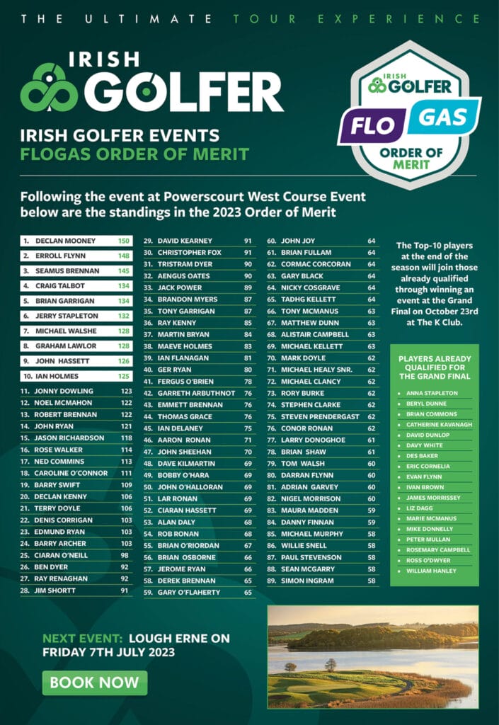 Following the latest event at Powerscourt West, the Order of Merit listing is shown below and as always the four best scores for each player across the season count, with the top 10 players not already qualified for the Grand Final joining us at The K Club in October 23rd to compete for the Champion Golfer 2023 title.