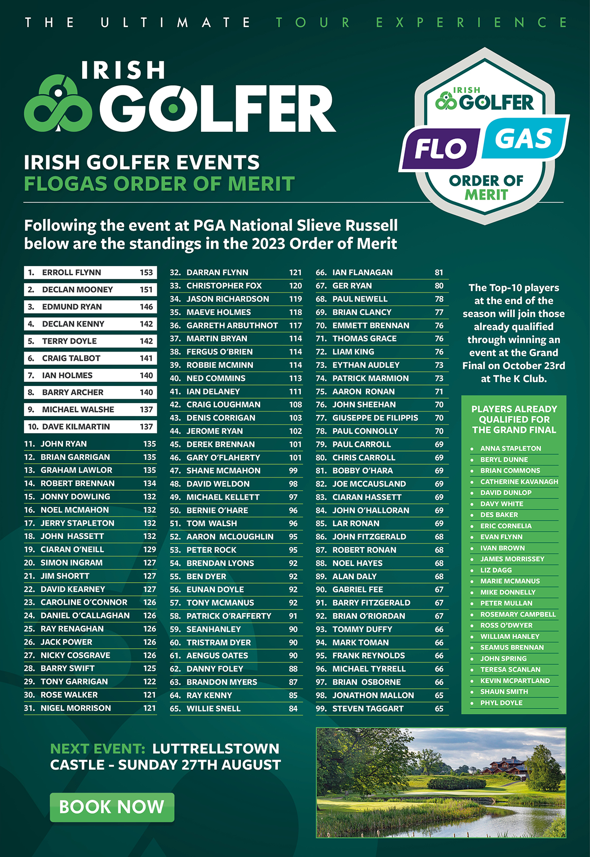 Following the latest event at PGA National Slieve Russell, the current Flogas Order of Merit listing is shown below and as always the four best scores for each player across the season count, with the top 10 players not already qualified for the Grand Final joining us at The K Club on October 23rd to compete for the Champion Golfer 2023 title.