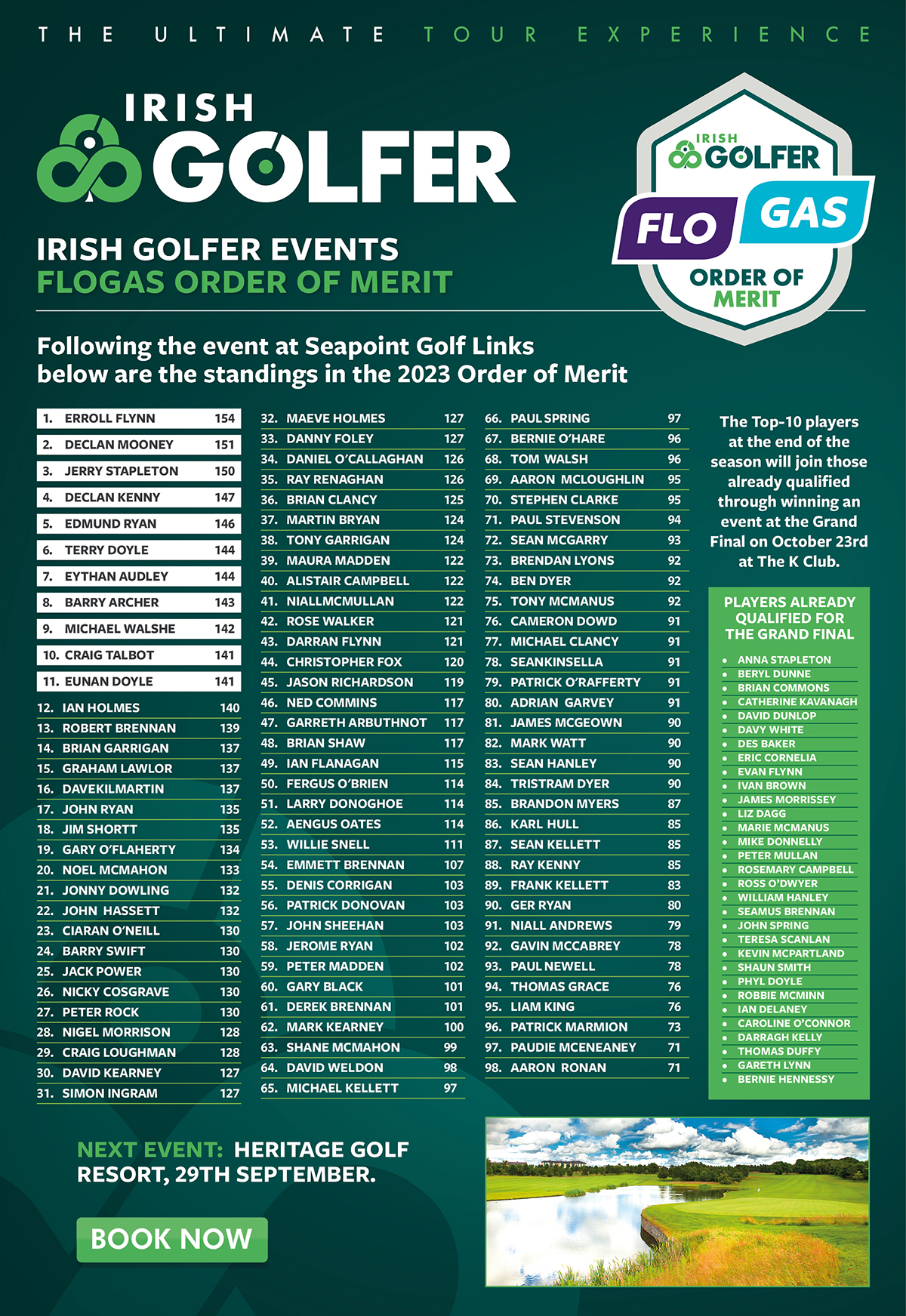 Following the latest event at Seapoint Golf Links the current Flogas Order of Merit listing is shown below and as always the four best scores for each player across the season count, with the top 10 players not already qualified for the Grand Final joining us at The K Club on October 23rd to compete for the Champion Golfer 2023 title.