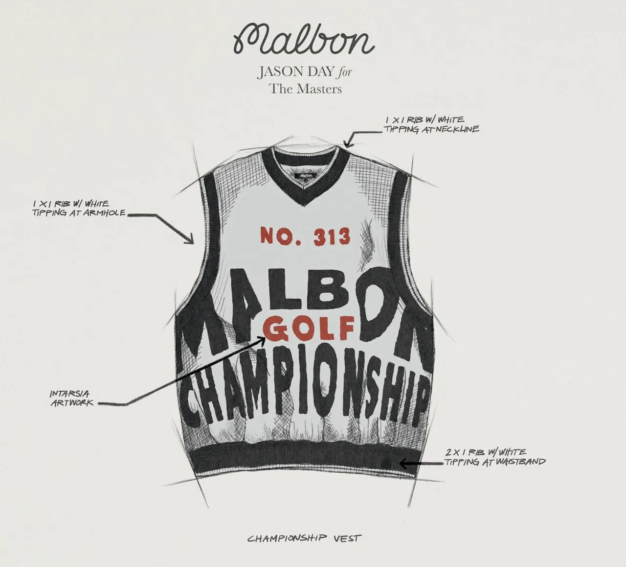 Day was once again trend setting on day two at Augusta as he returned to the course to finish the final four holes of his opening round sporting a Malbon ‘Championship vest’ with No.313 and the words ‘Malbon Golf Championship’ in huge print across the chest.