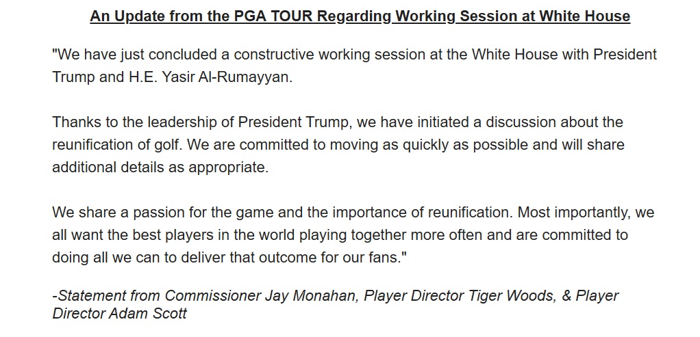 “Thanks to the leadership of President Trump, we have initiated a discussion about the reunification of golf,” Monahan said. “We are committed to moving as quickly as possible and will share additional details as appropriate.