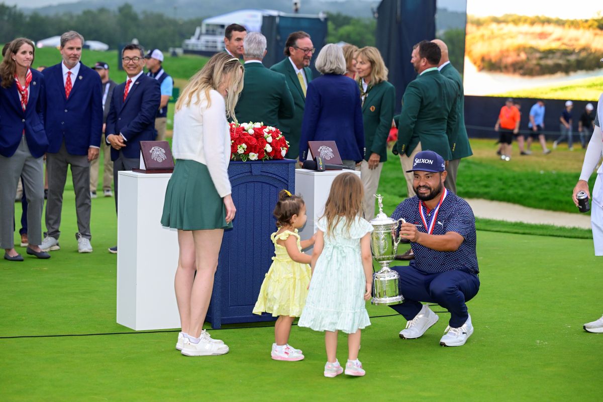 More photos followed — with the USGA, with Oakmont members, with his family (his wife, Melody, and their two daughters), his agent, caddie, coaches and friends. Some security guards, nearing the end of their week-long shift, gathered on the green for front-row seats.