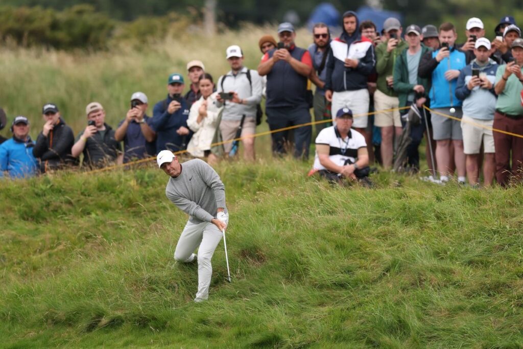 After being a little wild when hitting the big stick off the tee in round one, Rory McIlroy’s first swipe with driver on day two saw him send his ball hurtling towards the out-of-bounds on the right, only for a fortuitously-placed clump of lengthy grass/rushes to come to his rescue. He then took a penalty drop from waist-high rough into knee-high rough and still managed to save par. Had he tried to hack his way out of the thicket he was in, God only knows what would’ve happened.