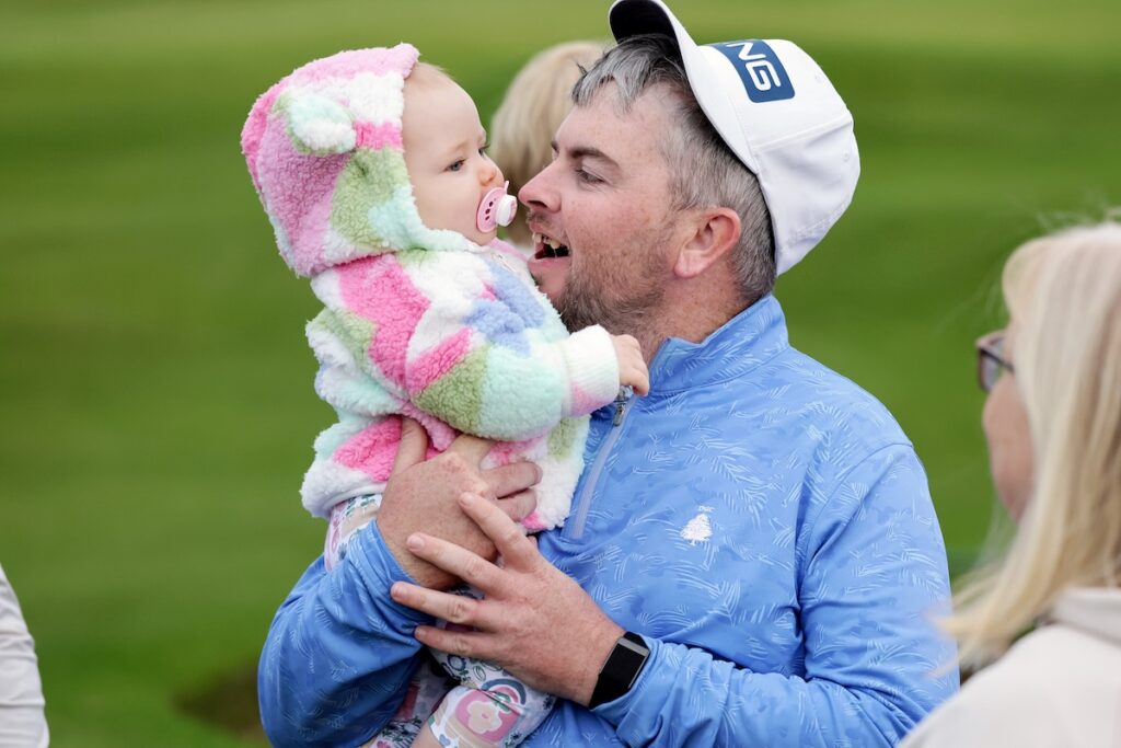 He had a brief glance right of the 17th tee and saw his daughter in the arms of his wife and that spurred him on to hit two cracking shots into 17 to set up a crucial birdie and he held his nerve going down the last to two-putt for the slam.