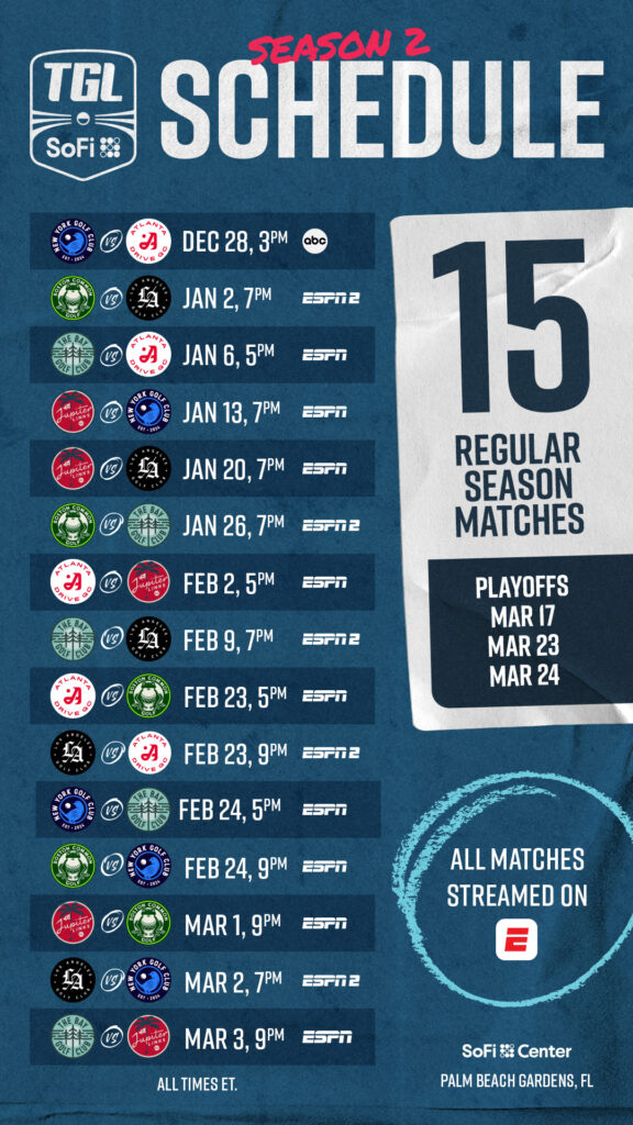 Jupiter Golf Links and Boston Common Golf Club will face off in the first ever Sunday night match on March 1, following the conclusion of the PGA Tour’s Cognizant Classic at PGA National, and the regular season concludes on March 3, with the top four teams advancing to the playoffs where the semi finals will be played on St Patrick’s Day, and the final contested over a best-of-three on March 23 and 24.