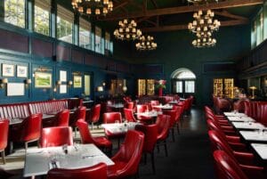 But it is ‘The Carriage House’ that takes centre stage. This gastro-style pub presents guests with two options. On one side is the restaurant wrapped in dark walls, rich red leather chairs, comfortable banquettes and luxury flourishes of marble and brass. Old wooden beams stretch across the high vaulted ceiling and it feels like a step back in time. The other half is the bar with its cosy nook feel, open fireplace and green leather chairs and sofas. Except for the golf flags, pennants, posters and art on the wall, you might even think you were in first class on the Titanic. It has that warm, plush atmosphere that exudes sophistication.