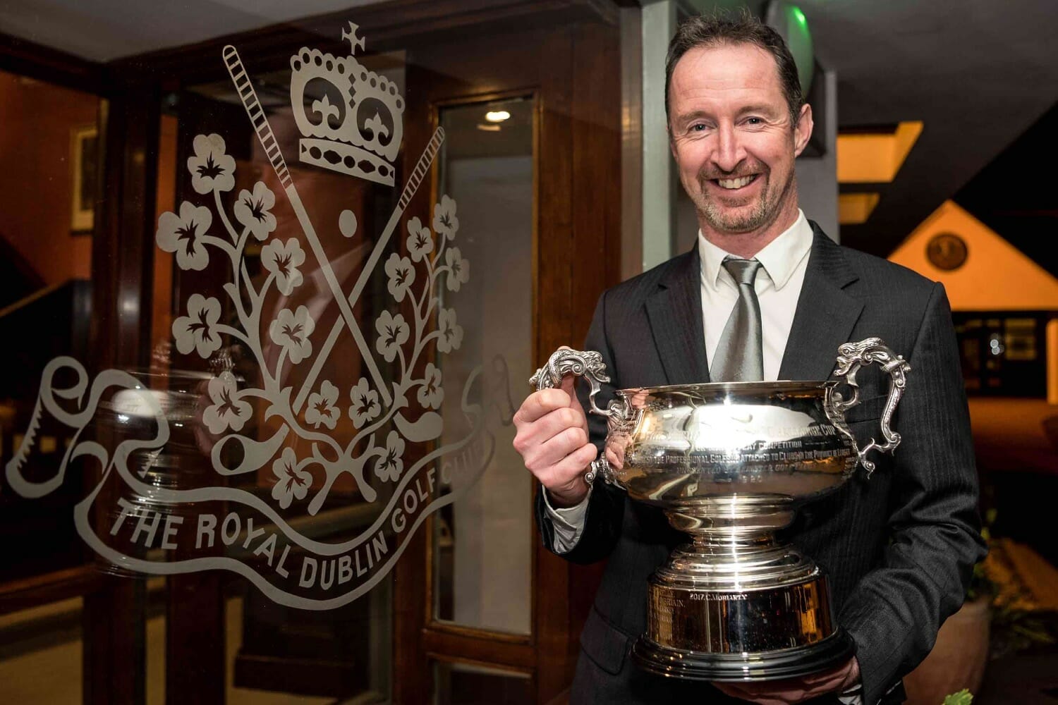 The iconic Michael ‘Dyke’ Moran centenary pro-am was contested at The Royal Dublin. Eamonn Brady with the Moran Cup Trophy Moran was born in 1886 in a small one-roomed cottage on Bull Island, Dollymount in the demesne of what was to become the Royal Dublin Golf Club. He was an assistant to professional, Tom Hood at Royal Dublin before taking up the job of professional at Dundalk GC in 1907. He then moved to Galway GC in 1908 before returning to Royal Dublin in 1909 as playing professional. A group of Irish professionals convened a meeting in the North Star Hotel in Amiens Street, Dublin in 1907 to form the Irish PGA; Moran of Royal Dublin was elected its first chairman. He won the Irish Professional Championship for five consecutive years from 1909 to 1913, a feat which has never been equalled. He enlisted in the South Irish Horse Regiment in 1915 and later transferred to the Royal Irish Regiment. Michael Moran was 32 years of age when he died of wounds in France on 10th April 1918; 100 years ago and is buried at Le Cateau Military Cemetery in France. The Moran Cup was inaugurated in 1920 by the Southern Branch of the Irish PGA to commemorate the career of Michael Moran and this year he was fondly remembered once more. Legendary journalist, Dermot Gilleece, was on hand to narrate the life of Moran while some recognisable names in golf picked up prizes on the day. Clontarf’s Eamonn Brady won the individual strokeplay event with a superb six-under-par 66 that saw him scoot three shots clear of Michael McDermott and Brian Jnr McCormack in second place. While the team event was won by St Annes, led by Cormac Hennessy alongside Ben Headon, Tom Menery and Tom Brophy who fired 89 points to take the prize on countback from Eoin O’Connor’s Kilkenny side. Irrespective of who took home the prizes, however, a great day played out in fine spirit was enjoyed by all.