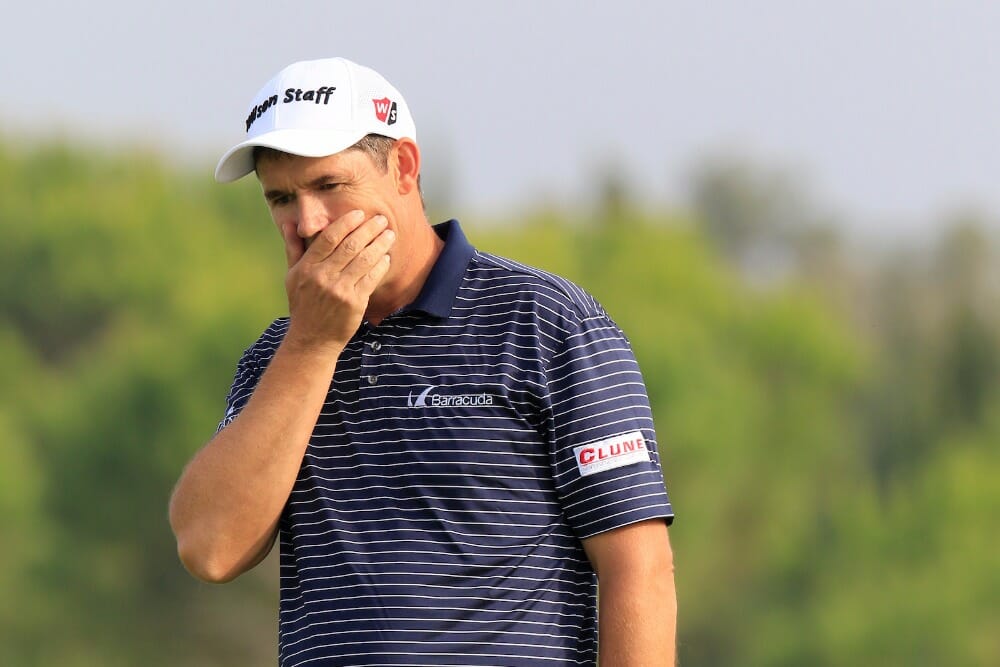 On Monday Harrington was hit on the elbow by an amateur in a freak accident during a coaching session.