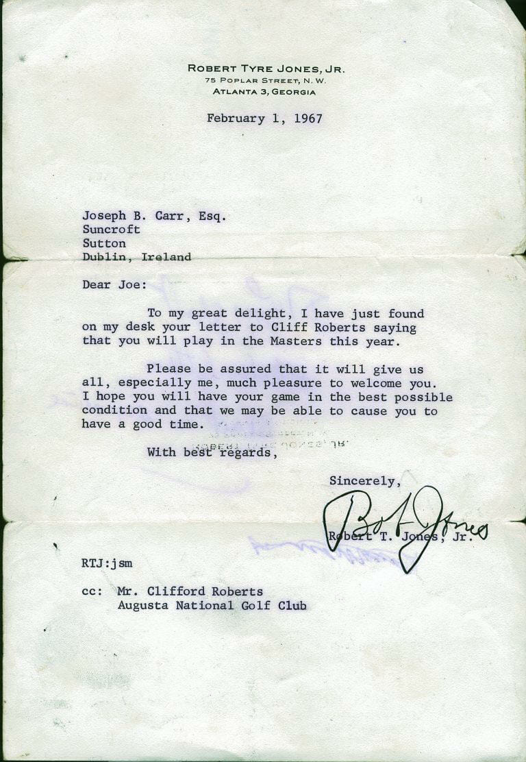 The most treasured letter my father ever received was a personal letter from Bobby Jones in response to his accepting an invitation to play in his first Masters in 1967. He played again in 1968 and 1969.