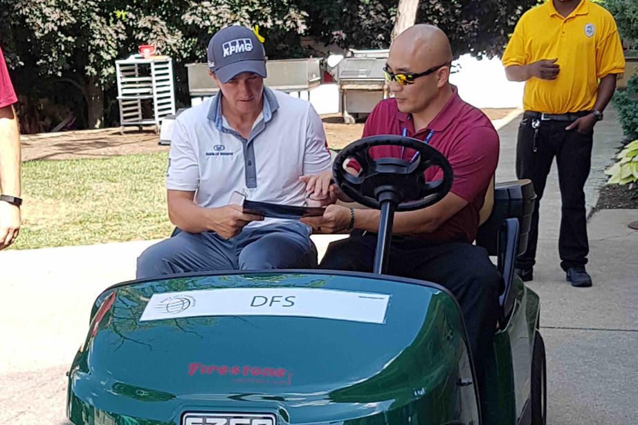 Paul Dunne heading to the random drug test after his third round at Firestone / Image from @TourMiss