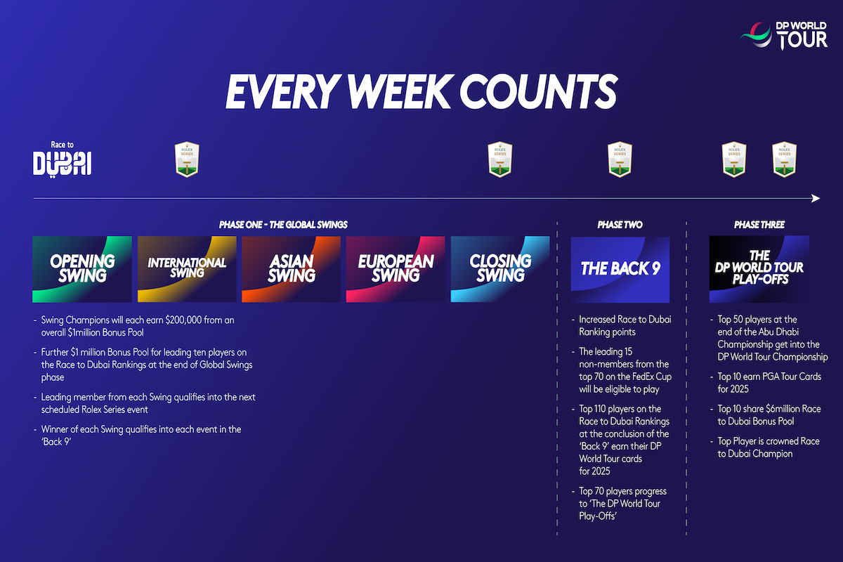 The 2024 Race to Dubai will feature three new and distinct phases – five innovative ‘Global Swings’ from November 2023 to August 2024; an historic ‘Back 9’ from September 2024 to October 2024; and two ‘DP World Tour Play-Offs’ in November 2024.