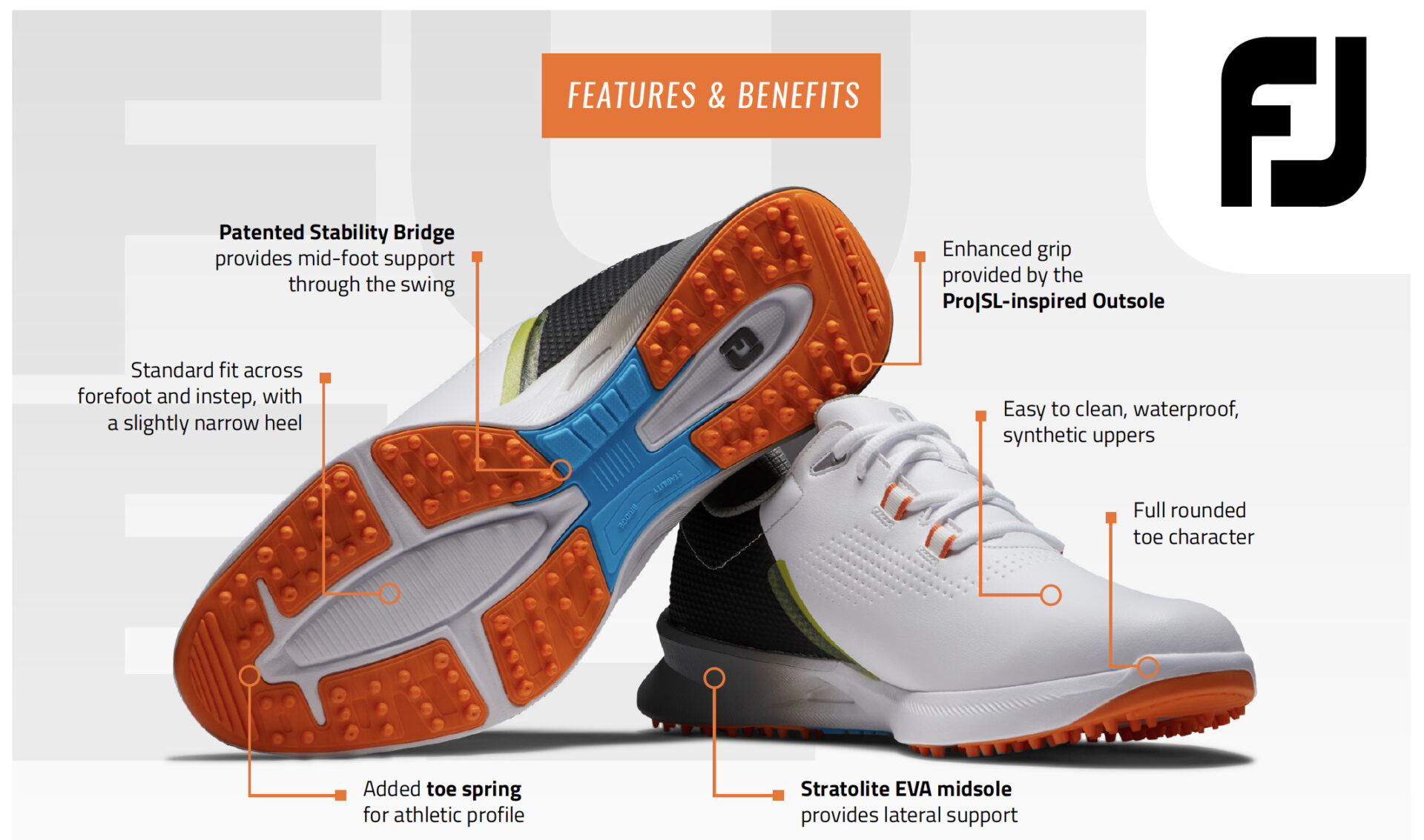 The shoe targets modern golfers seeking a sharp, athletic silhouette, by combining streamlined, waterproof, synthetic uppers with sculptured design elements, including a mid-foot bevel and an exaggerated platform.