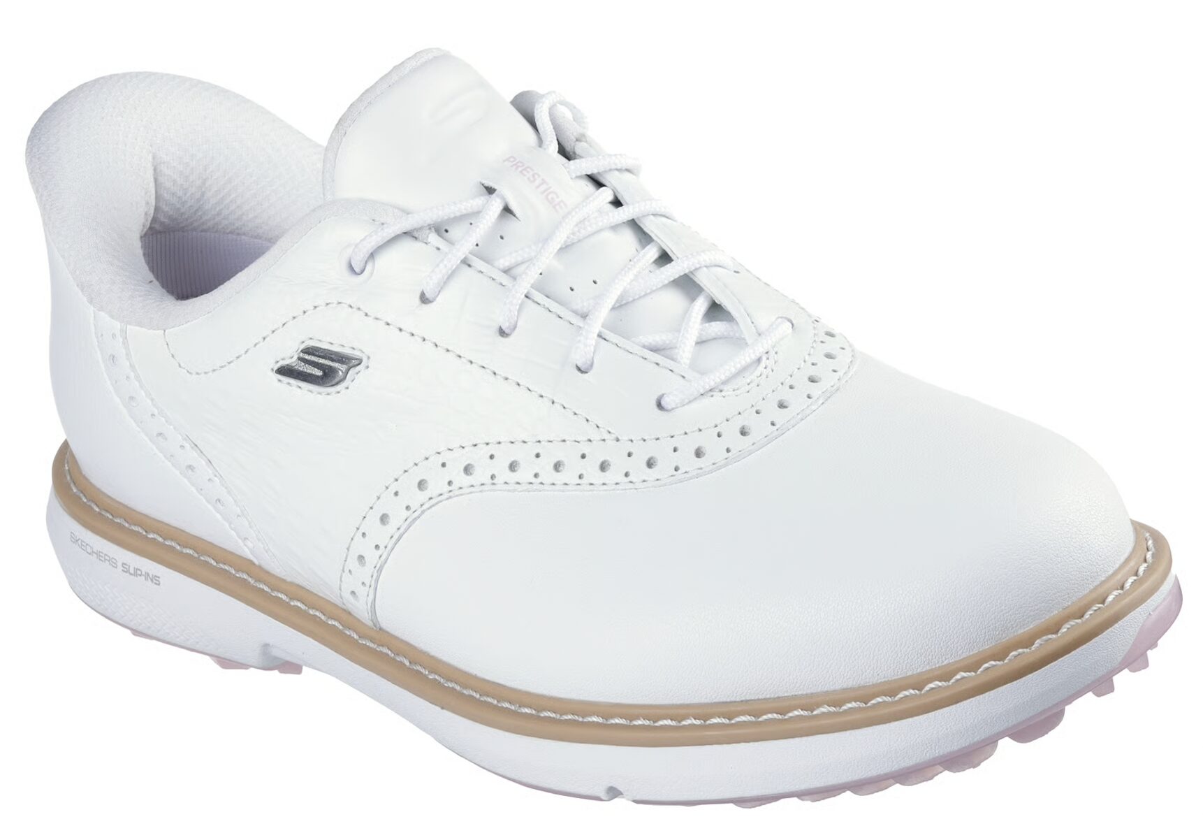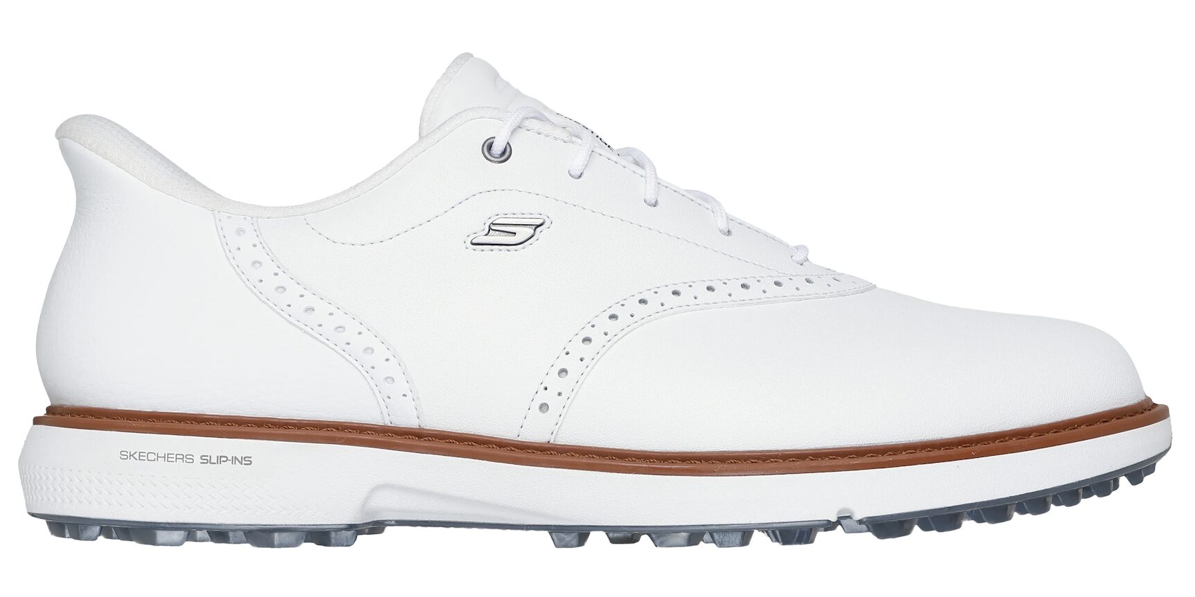 The new Skechers GO GOLF Prestige offers a seamless transition from the course to the club with its classic silhouette and full-grain leather upper. Designed with a very snug Heel Pillow, this waterproof golf design features a lace-up leather upper with saddle oxford details, a removable Arch Fit insole, lightweight ECO FLIGHT cushioning, and replaceable Tour Flex Pro SoftSpikes. A very traditional looking golf shoe that takes Skecher’s slip-in tech to a whole new level. The Prestige golf shoe is as comfortable and functional as they come.