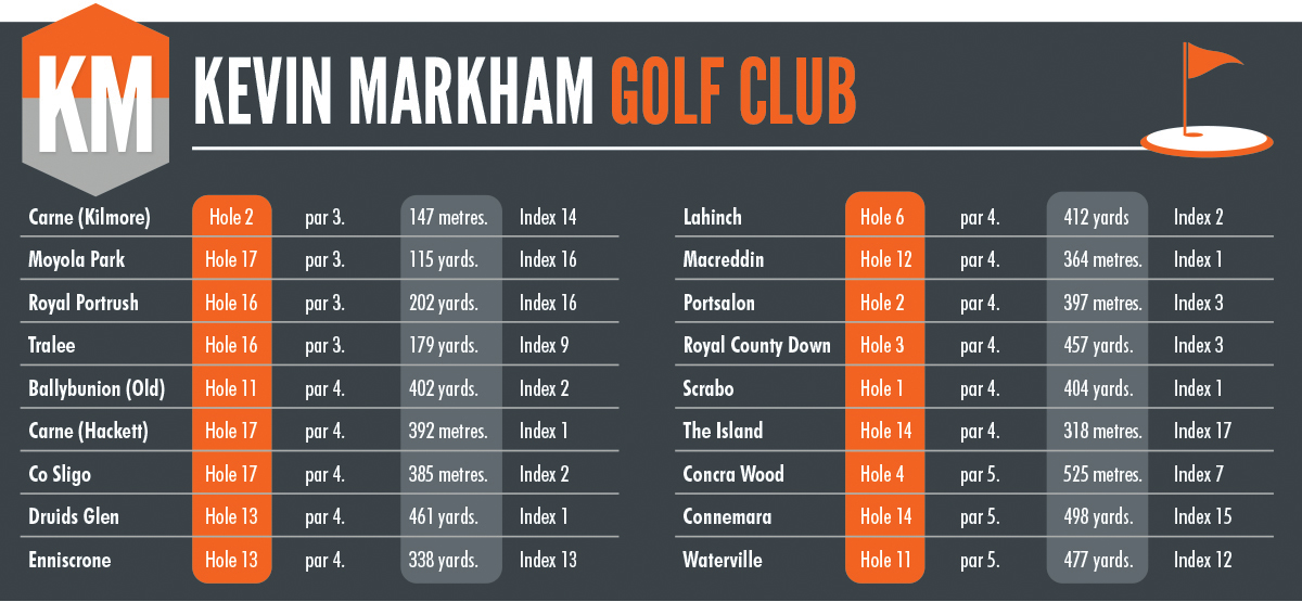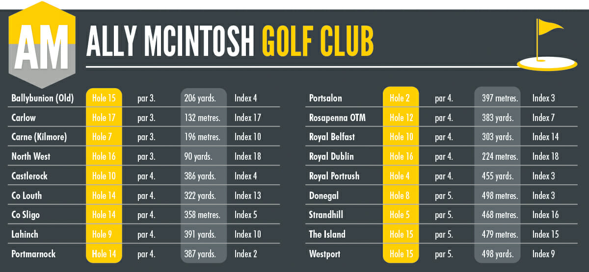 The list is a combination of the classic and the modern. It doesn’t get much better or more classic than The Dell at Lahinch, the 17th at County Sligo or the 2nd at Mullingar. It emphasises how the architects of old created something for the ages. In terms of the modern, Eddie Hackett’s 17th at Carne is brutal brilliance while the 13th at Druid’s Glen, designed by Ruddy & Craddock, is another beauty to be feared.