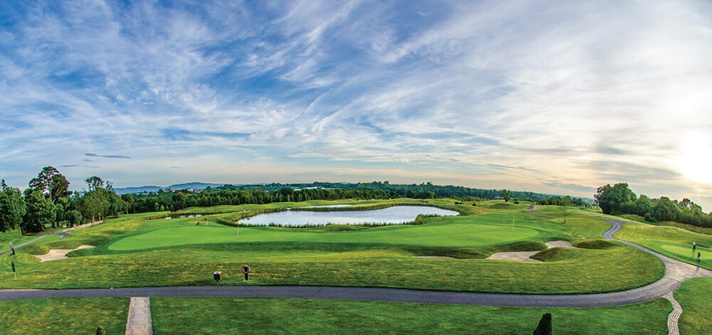 Powerscourt’s original course mixes an opening tree-drenched corner with a more open, curvaceous terrain before trees and water return for a grandstand finish. Views of the Great Sugar Loaf follow you all day.
