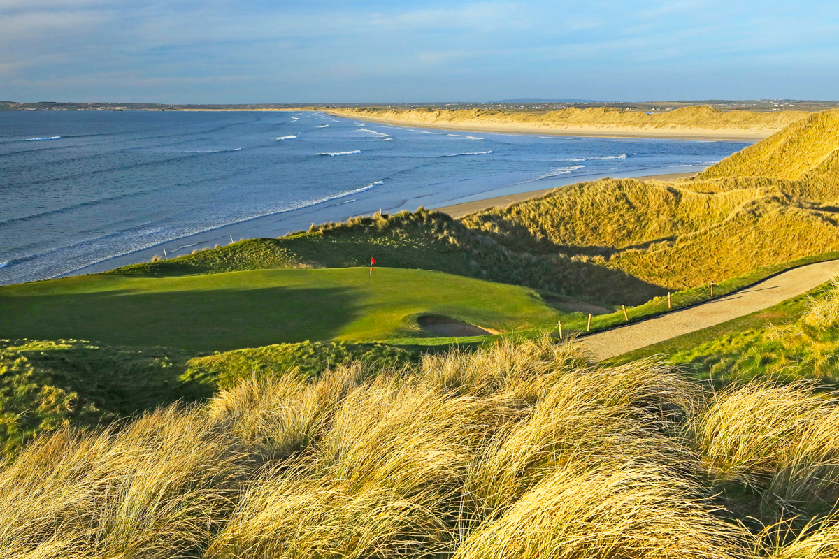 17. TRUMP INTERNATIONAL DOONBEG www.trumphotels.com/ireland Upgrade work has been ongoing at Doonbeg since Martin Hawtree made considerable changes in 2015, and the most notable of these in 2021 was a remodelling of the wonderful par three 9th. Tucked away at the farthest point of the links, hanging over the beach on Doughmore Strand, it is a par three of beauty and drama. It is little wonder that with so many impressive holes its stock remains high. The course slides elegantly through the dunes for almost two miles above the beach and has been enjoying fabulous conditioning in recent times. VERDICT: A modern, big-scale links with a five-star experience. (DOWN 1)