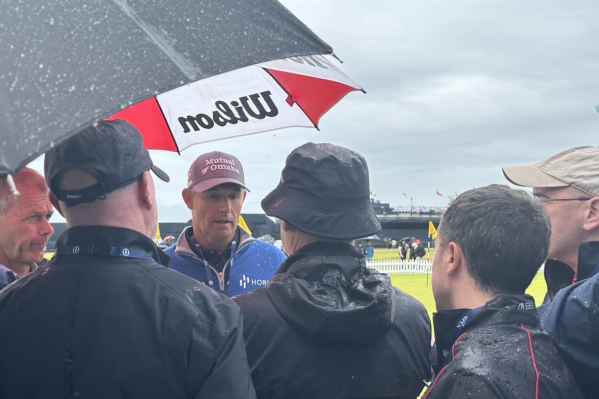 ‘Sorry, I didn’t know I left you guys in the rain,’ jokes a bone dry Pádraig Harrington to the Irish media under the comfort of his large red Wilson umbrella.